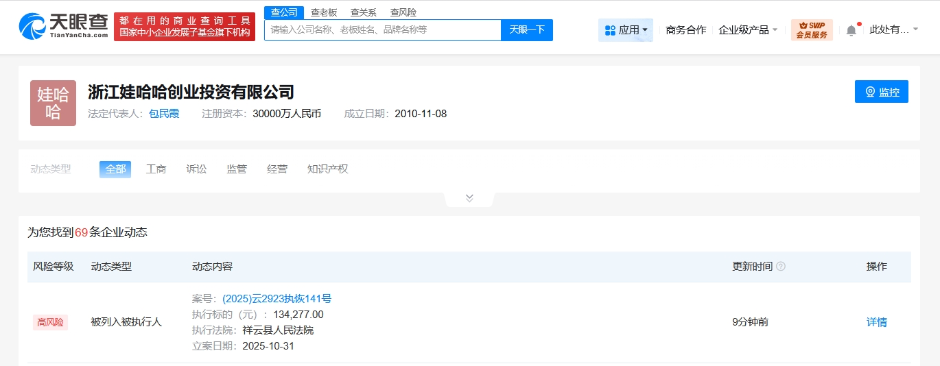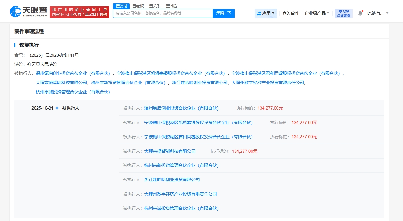 每经AI快讯,天眼查天眼风险信息显示,近日,浙江娃哈哈创业投资有限公司、大理宗盛智能科技有限公司、杭州宗新投资管理合伙企业(有限合伙)等新增一则恢复执行信息,执行标的逾13.4万元,执行法院为云南省大理白族自治州祥云县人民法院。浙江娃哈哈创业投资有限公司成立于2010年11月,法定代表人为包民霞,董事为宗馥莉,注册资本3亿元人民币,经营范围为股权投资、创业投资、私募股权投资基金管理、创业投资基金管理服务、自有资金投资的资产管理服务等。股东信息显示,该公司由杭州娃哈哈宏振投资有限公司、施幼珍共同持股。