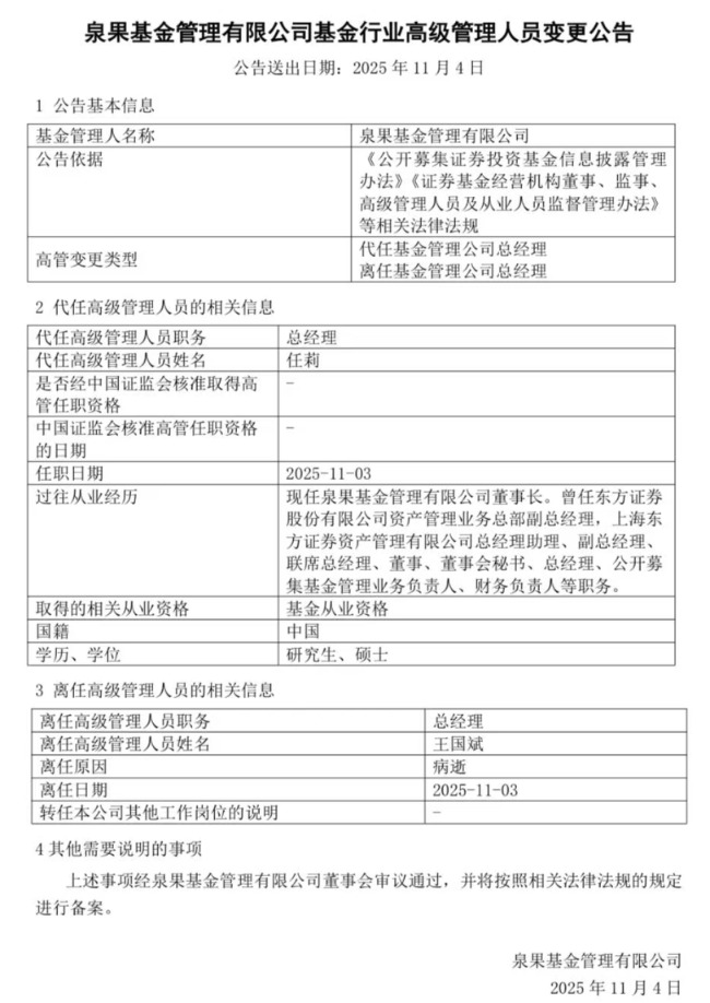 11月3日,泉果基金发布高级管理人员变更公告,王国斌病逝,由董事长任莉代任总经理职务,任职日期2025年11月3日。