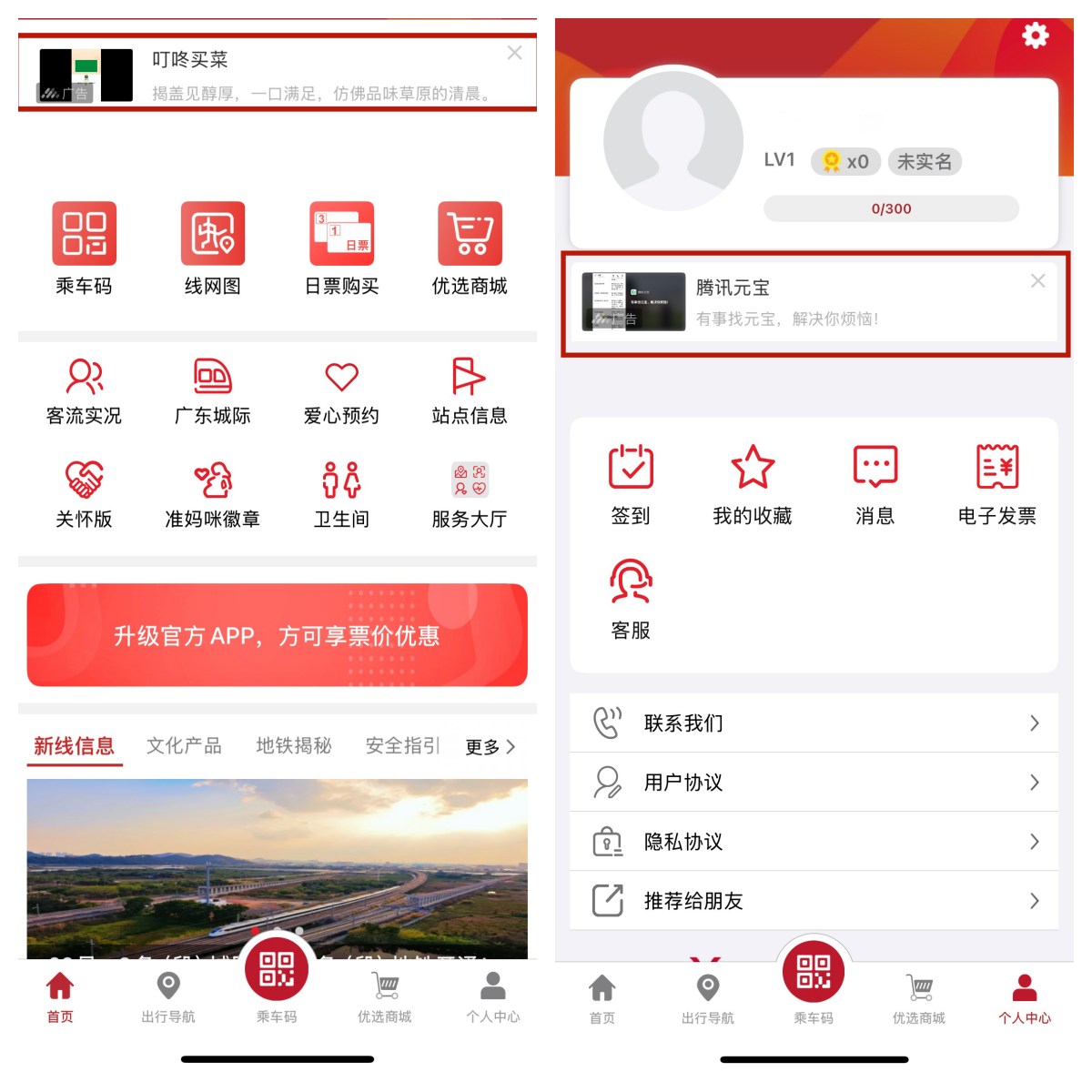 界面新闻注意到,目前打开广州地铁APP上的乘车码,已无“摇一摇”广告,但在APP首页顶部及个人中心页面仍有文字广告,点击后可直接跳转至投放广告软件的下载页面。