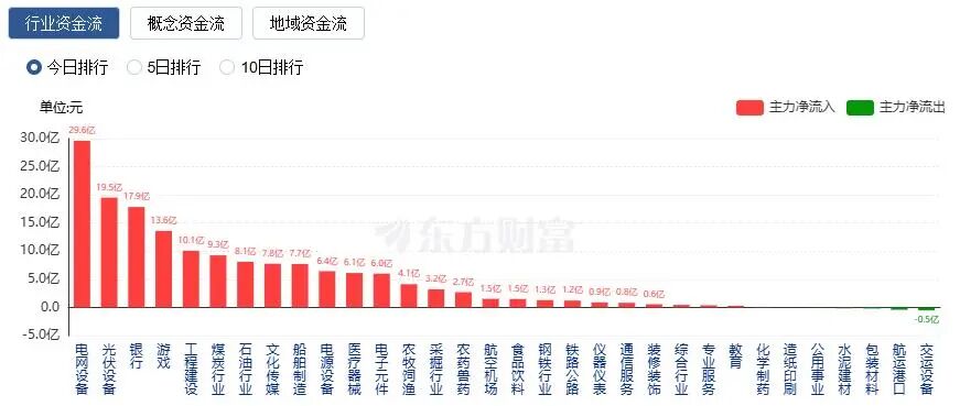 行业资金方面,截至收盘,电网设备、光伏设备、银行等净流入排名靠前,其中电网设备净流入29.62亿。