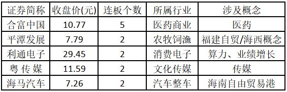 从连板情况来看,今日首板个股有56只;2连板的个股有9只;3连板及以上的个股有1只。今日连板数排名前5的个股包括合富中国、平潭发展、利通电子、粤传媒、海马汽车,具体如下表所示。
