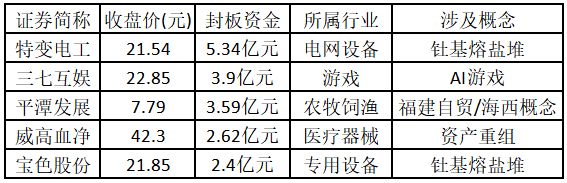 从封板资金来看,今日涨停板个股中,封板资金排名前5的个股包括特变电工、三七互娱、平潭发展、威高血净、宝色股份。