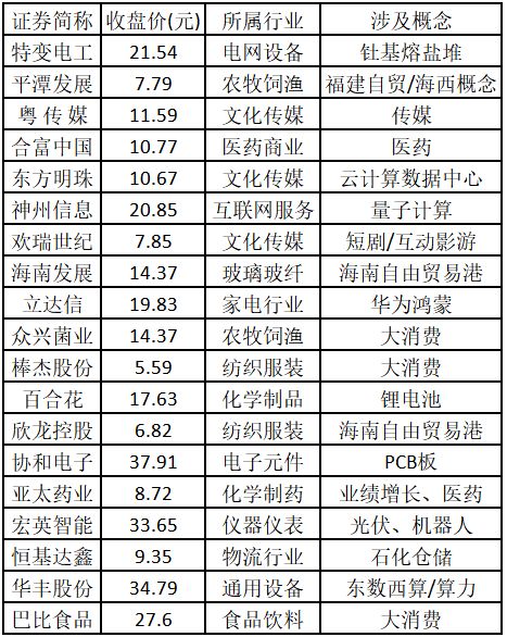 涨停板个股中,股价创出近一年新高的个股有19只(不包括创出历史新高的个股),包括特变电工、平潭发展、粤传媒、合富中国、东方明珠、神州信息、欢瑞世纪、海南发展、立达信、众兴菌业、棒杰股份、百合花、欣龙控股、协和电子、亚太药业、宏英智能、恒基达鑫、华丰股份、巴比食品,具体如下表所示。