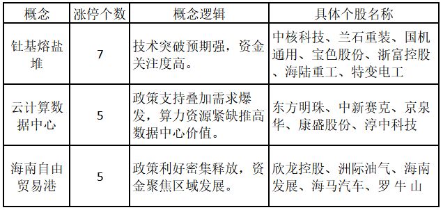 从概念特征来看,今日涨停板个股中,钍基熔盐堆、云计算数据中心、海南自由贸易港等概念的个股最多。