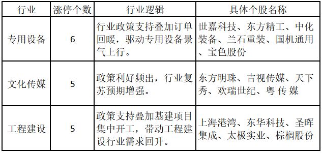 从行业特征来看,今日涨停板个股中,专用设备、文化传媒、工程建设行业的个股最多。