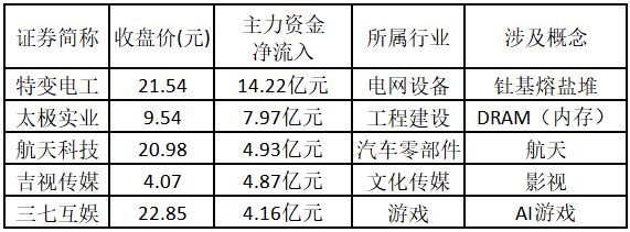 从主力资金来看,今日涨停板个股中,主力资金净流入金额排名前5的个股分别为特变电工、太极实业、航天科技、吉视传媒、三七互娱。