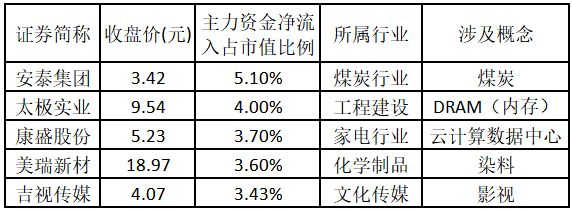 主力资金净流入金额占市值比例排名前5的个股分别为安泰集团、太极实业、康盛股份、美瑞新材、吉视传媒。