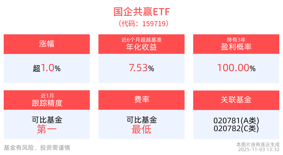 截至2025年11月3日 13:32,国企共赢ETF(159719)上涨1.06%,最新价报1.62元。拉长时间看,截至2025年10月31日,国企共赢ETF近2周累计上涨1.40%。