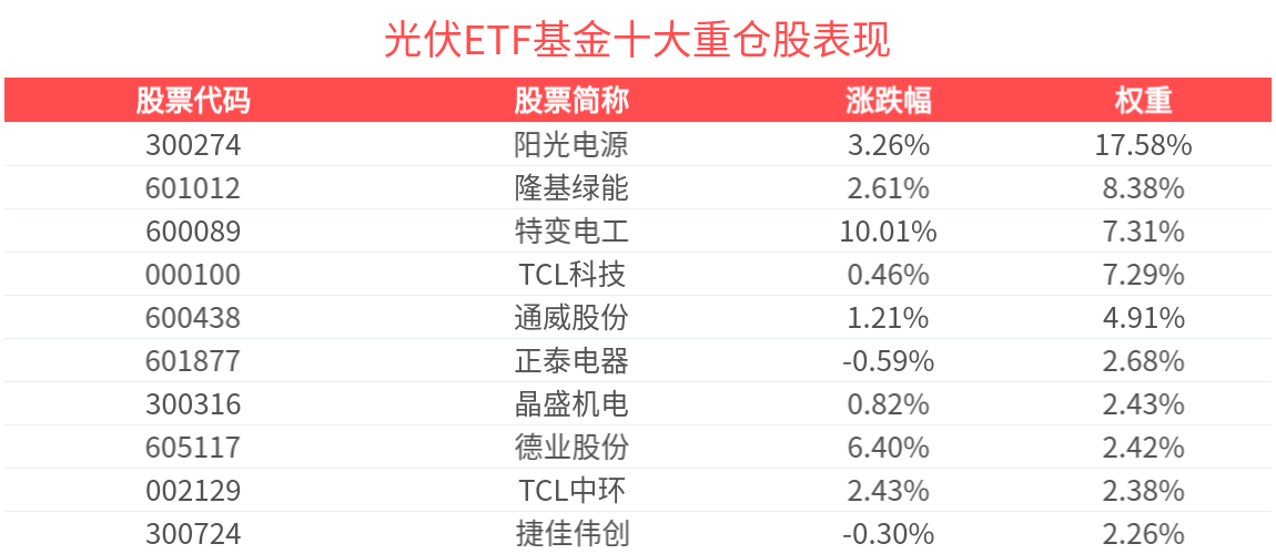 光伏ETF基金紧密跟踪中证光伏产业指数,中证光伏产业指数从主营业务涉及光伏产业链上、中、下游的上市公司证券中,选取不超过50只最具代表性的上市公司证券作为指数样本,以反映光伏产业上市公司证券的整体表现。