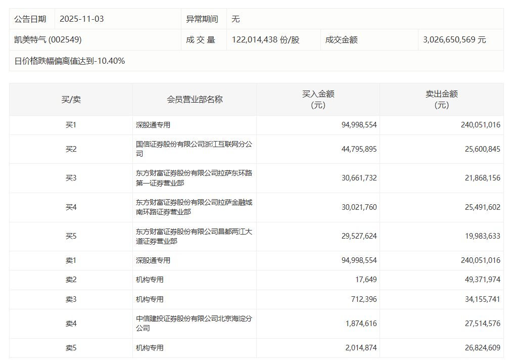 凯美特气今日跌9.96% 有3家机构专用席位净卖出1.08亿元