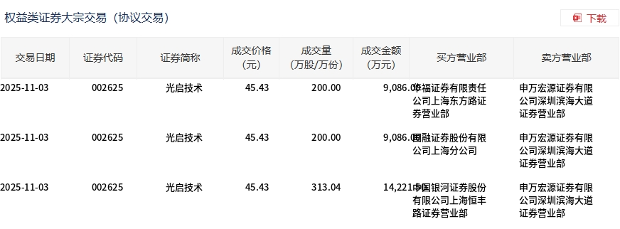 光启技术今日大宗交易折价成交713.04万股,成交额3.24亿元