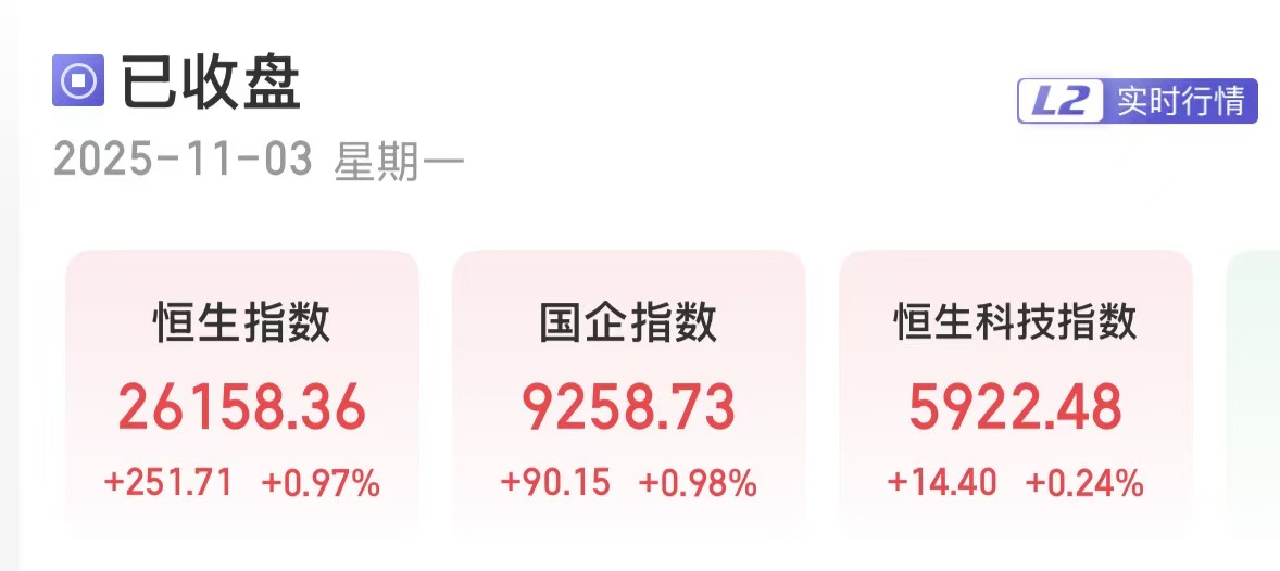 11月3日,港股三大指数集体收涨。截至收盘,恒生指数涨0.97%,报26158.36点;恒生国企指数涨0.98%,报9258.73点;恒生科技指数涨0.24%,报5922.48点。