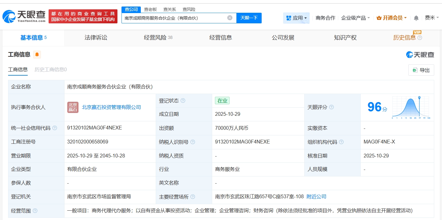 南方财经11月3日电,天眼查工商信息显示,近日,南京成顺商务服务合伙企业(有限合伙)成立,执行事务合伙人为北京赢石投资管理有限公司,出资额7亿人民币,经营范围包括商务代理代办服务、以自有资金从事投资活动、企业管理等。合伙人信息显示,该合伙企业由中信金融资产(02799.HK)、广州利信禾诚企业管理有限公司、北京赢石投资管理有限公司共同出资。
