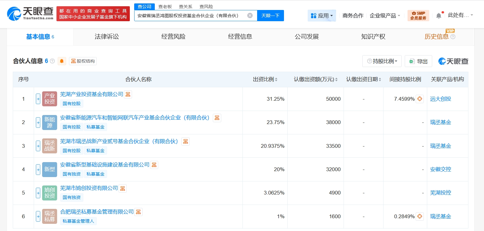 每经AI快讯,天眼查工商信息显示,近日,安徽省瑞丞鸿图股权投资基金合伙企业(有限合伙)成立,执行事务合伙人为合肥瑞丞私募基金管理有限公司,出资额16亿元人民币,经营范围为以私募基金从事股权投资、投资管理、资产管理等活动。合伙人信息显示,该基金由芜湖产业投资基金有限公司、安徽省新能源汽车和智能网联汽车产业基金合伙企业(有限合伙)、芜湖市瑞丞战新产业贰号基金合伙企业(有限合伙)、安徽省新型基础设施建设基金有限公司等共同出资。
