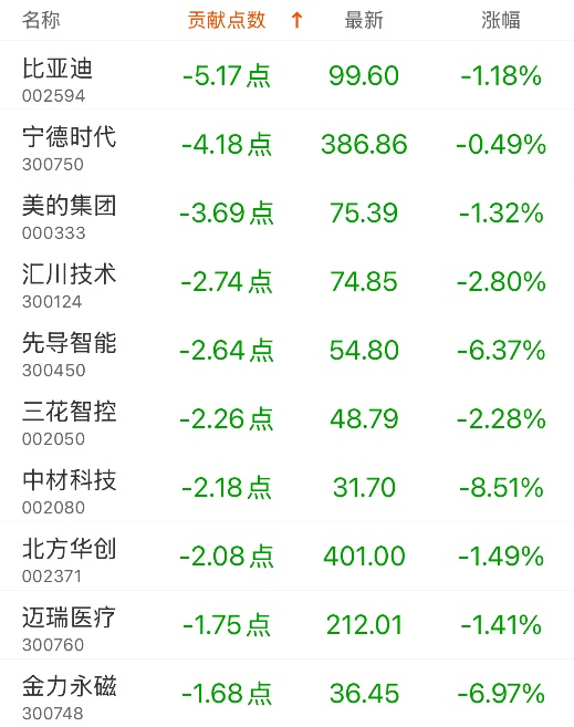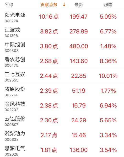 对深证成指贡献点数最多的个股是阳光电源,贡献10.16点,该股当日涨5.09%,收盘价199.47元;拖累点数最多的个股是比亚迪,拖累5.17点,该股当日跌1.18%,收盘价99.6元。