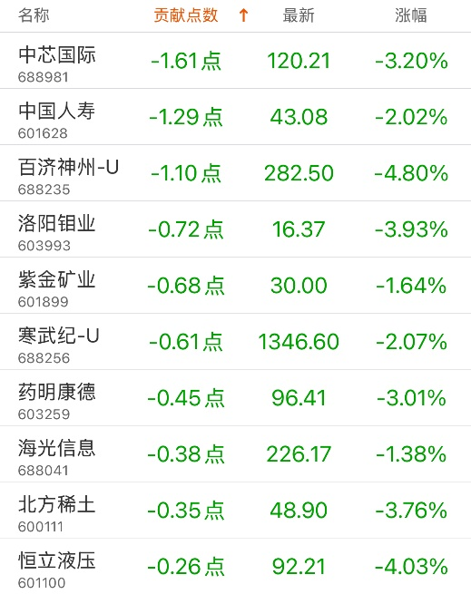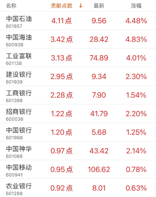 对上证指数贡献点数最多的个股是中国石油,贡献4.11点,该股当日涨4.48%,收盘价9.56元;拖累点数最多的个股是中芯国际,拖累1.61点,该股当日跌3.20%,收盘价120.21元。