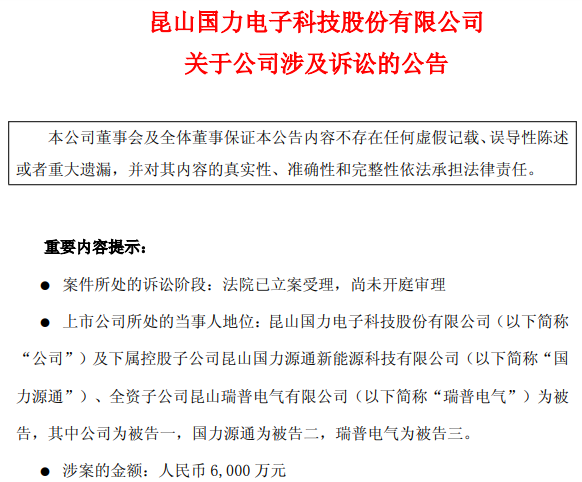 公司及控股子公司国力源通、全资子公司瑞普电气为被告,其中公司为被告一,国力源通为被告二,瑞普电气为被告三。涉案的金额6,000 万元,截至公告日,该案件尚未开庭审理。