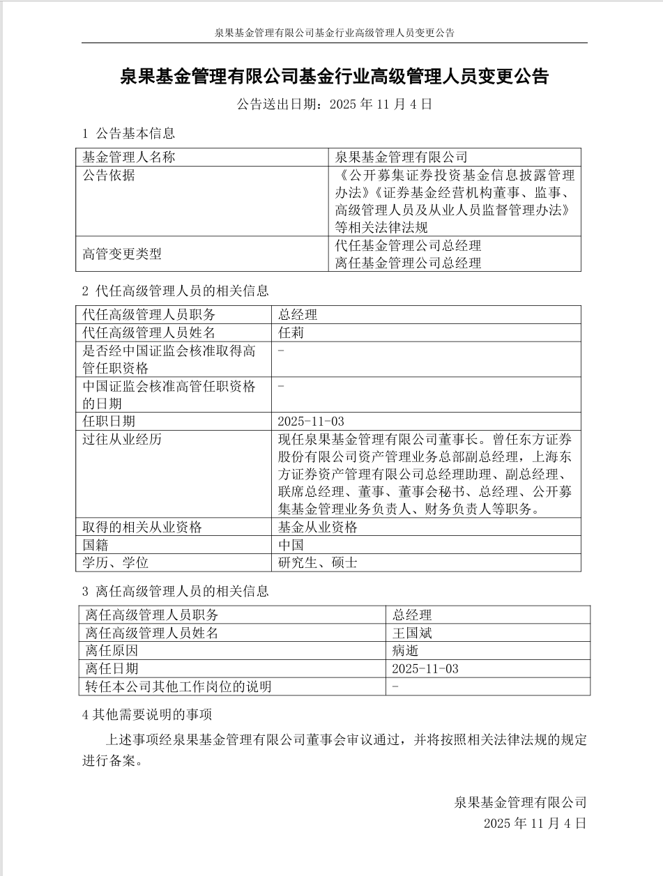 11月3日下午,泉果基金发布公告称,公司创始人王国斌病逝。目前泉果基金官网已变为灰色。目前总经理一职由公司董事长任莉代任。