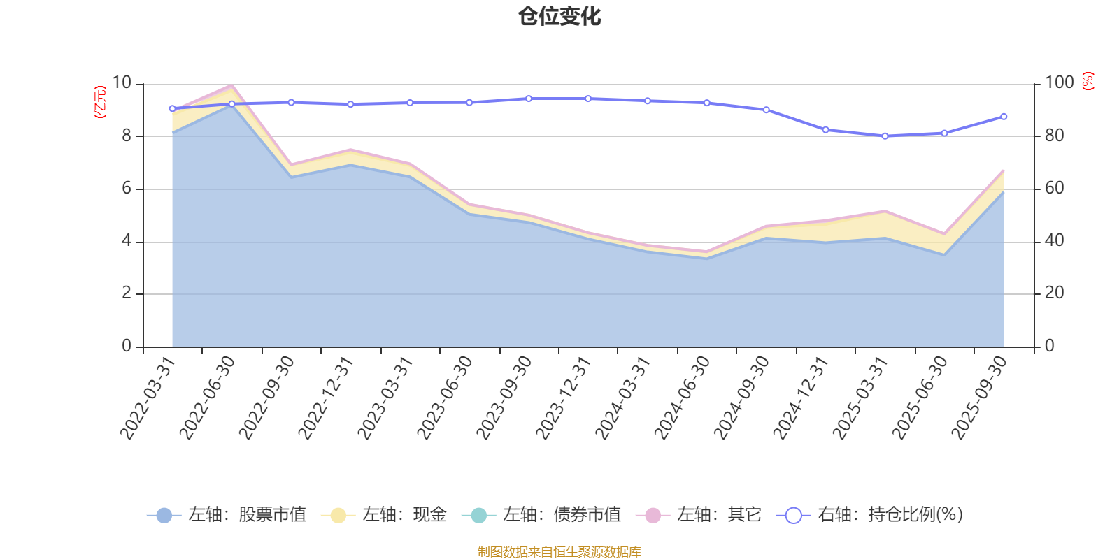 据定期报告数据统计,近三年平均股票仓位为89.57%,同类平均为85.66%。2023年三季度末基金达到94.41%的最高仓位,2025年一季度末最低,为80.15%。