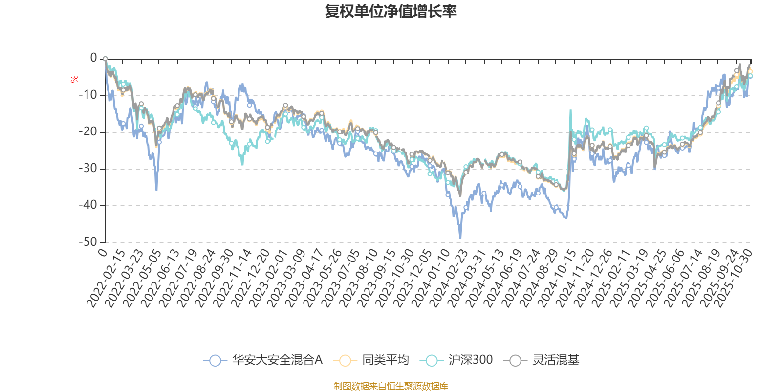 截至10月30日,华安大安全混合A近三个月复权单位净值增长率为5.79%,位于同类可比基金880/1287;近半年复权单位净值增长率为29.63%,位于同类可比基金477/1287;近一年复权单位净值增长率为23.53%,位于同类可比基金628/1287;近三年复权单位净值增长率为4.64%,位于同类可比基金928/1286。