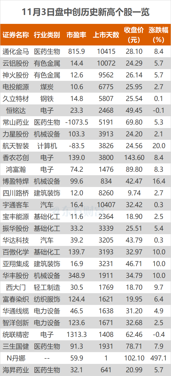 11月3日,A股三大指数今日集体小幅收涨,沪指涨0.55%,收报3976.52点;深证成指涨0.19%,收报13404.06点;创业板指涨0.29%,收报3196.87点。东方财富Choice数据显示,今日有28只个股盘中股价创历史新高,分别为航天智装、香农芯创等。