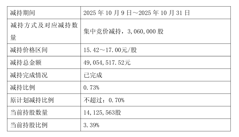 11月3日盘后,百合花(603823)公告称,因个人资金需求,公司实际控制人、董事长陈立荣于10月9日至10月31日通过集中竞价方式减持公司股份306万股,减持价格区间为15.42至17.00元/股,减持总金额为4905.45万元。