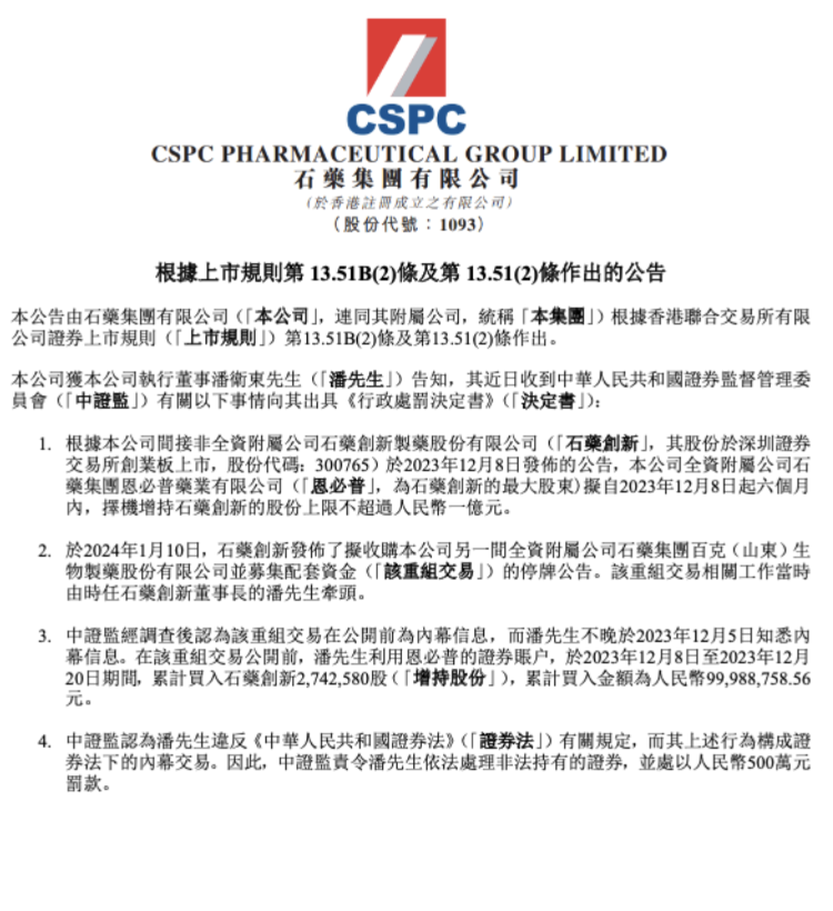 11月3日上午,石药集团(1093.HK)发布公告称,执行董事潘卫东因内幕交易被中国证监会处以500万元罚款。处罚决定显示,其在石药集团子公司石药创新(新诺威,300765)重组交易公开前,利用恩必普的证券账户累计买入石药创新股票274.26万股,买入金额高达9998.88万元。