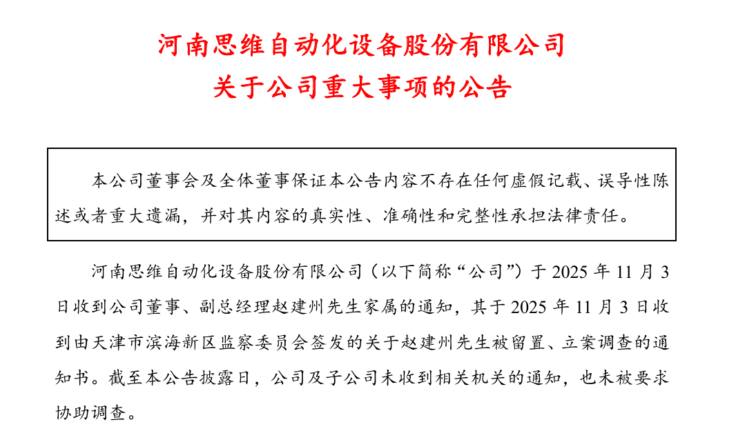 11月3日晚间,思维列控(603508)公告称,公司收到董事、副总经理赵建州先生家属的通知,其于2025年11月3日收到由天津市滨海新区监察委员会签发的关于赵建州先生被留置、立案调查的通知书。
