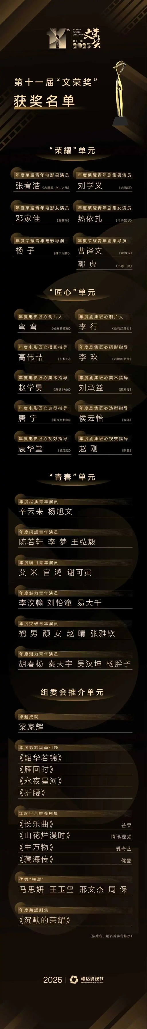 今年,“文荣奖”年度荣耀青年剧集男女演员、导演分别由刘学义(《念无双》)、热依扎(《灼灼韶华》)和《藏海传》导演曹译文、《书卷一梦》导演郭虎获得。电影方面,年度荣耀青年电影男女演员、导演由张宥浩(《志愿军》)、邓家佳(《野孩子》)和《捕风追影》导演杨子获得。年度荣耀剧集花落《沉默的荣耀》。