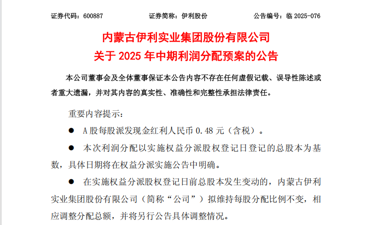 10月31日,伊利股份发布的2025年中期利润分配预案显示,拟向全体股东每股派发现金红利0.48元(含税),拟合计派发现金红利30.36亿元(含税)。