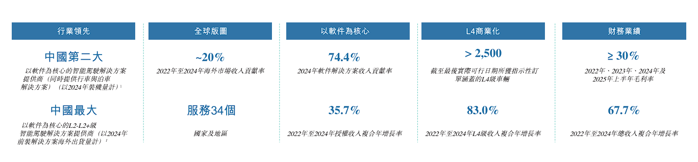 根据灼识咨询,按2024年装机量计,公司为第二大同时提供行车与泊车解决方案的,以软件为核心的L2-L2+级解决方案提供商,也是第三大DMS(即“驾驶员检测系统”)解决方案提供商。