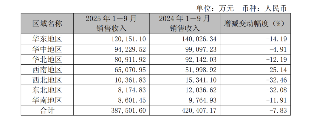 根据养元饮品三季度经营数据,该公司在华东、华中、华北等七大销售区域的销售收入全线下滑。其中东北地区、西北地区销售收入降幅最大,分别下滑32.08%、32.46%。