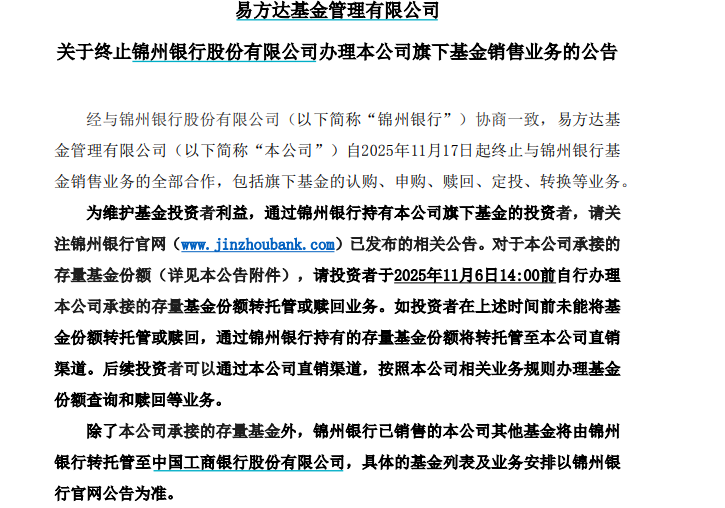 11月3日,易方达基金发布公告称,经与锦州银行协商一致,公司自2025年11月17日起终止与锦州银行基金销售业务的全部合作,包括旗下基金的认购、申购、赎回、定投、转换等业务。