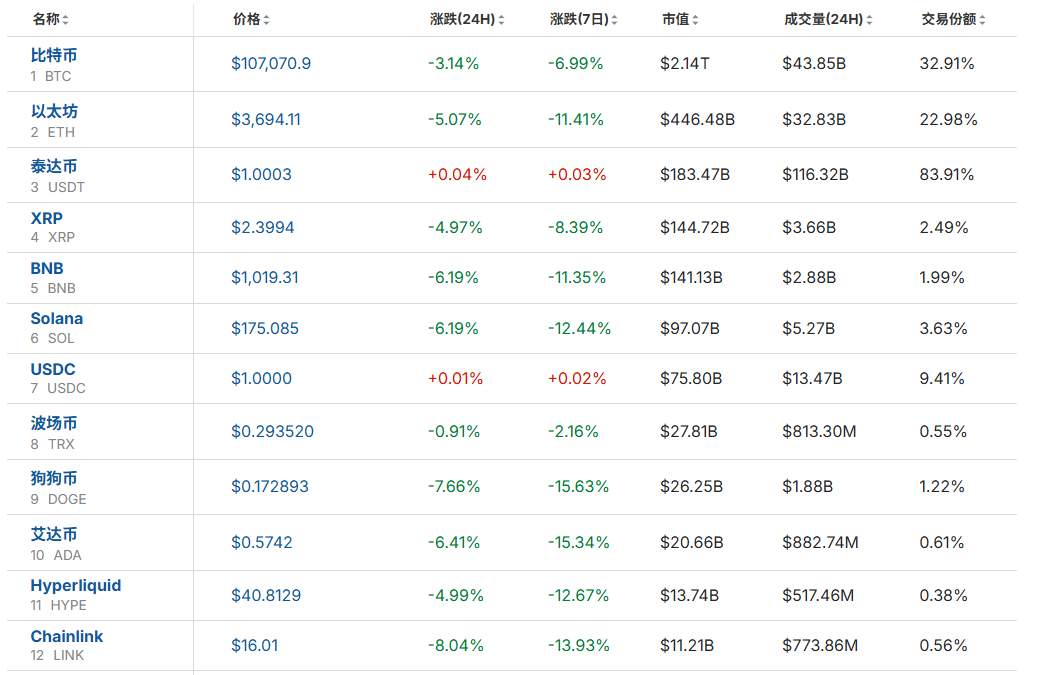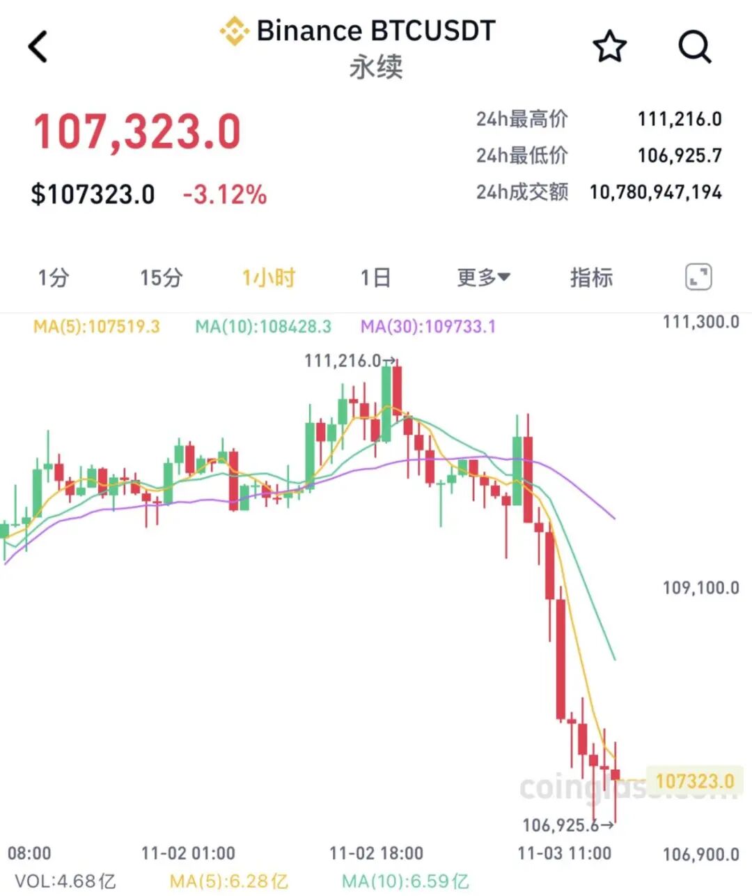 11月3日,加密货币市场集体大跌,比特币一度失守107000美元/枚,现跌超3%。