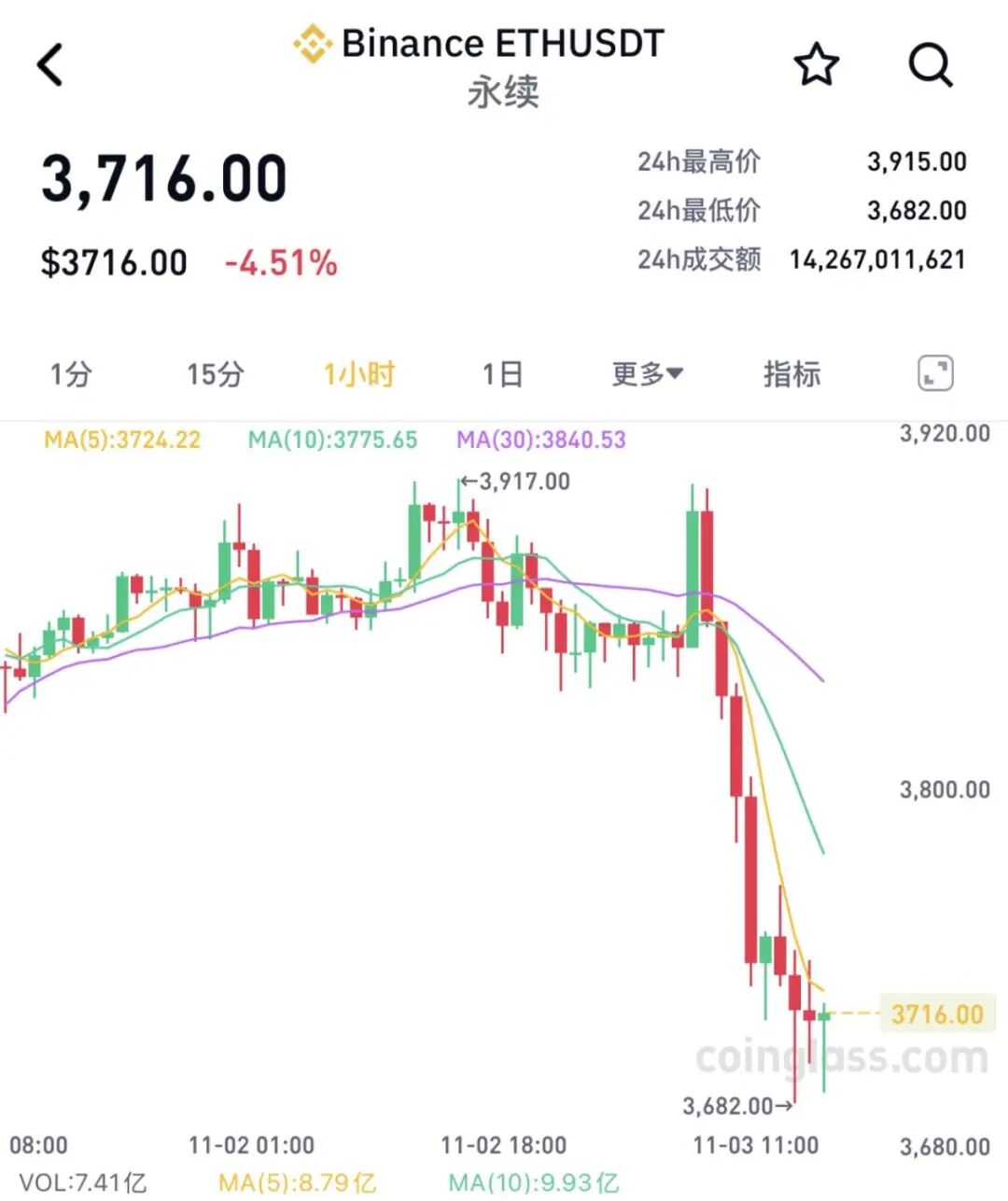 以太坊日内跌幅扩大至4%,一度跌破3700美元/枚。
