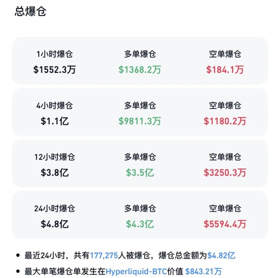 CoinGlass数据显示,过去24小时加密货币市场共有近18万人被爆仓,爆仓总金额为4.82亿美元,其中多单爆仓4.3亿美元,空单爆仓5594.4万美元。其中,最大单笔爆仓发生在Hyperliquid-BTC。