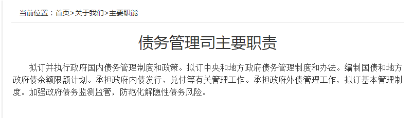债务管理司主要职责为:拟订并执行政府国内债务管理制度和政策。拟订中央和地方政府债务管理制度和办法。编制国债和地方政府债余额限额计划。承担政府内债发行、兑付等有关管理工作。承担政府外债管理工作,拟订基本管理制度。加强政府债务监测监管,防范化解隐性债务风险。