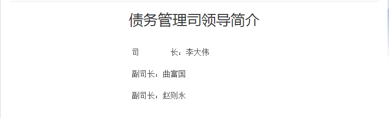 债务管理司领导包括:司长李大伟,副司长曲富国,副司长赵则永。债务管理司设六个处:综合处、中央债务处、地方债务一处、地方债务二处、发行兑付处、监测管理处。