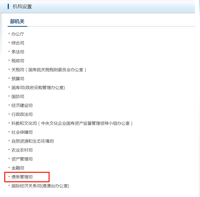 近日,财政部官网“机构设置”栏目更新信息显示,财政部债务管理司已列入“部机关”列表。