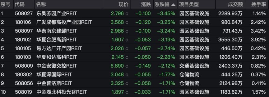 值得一提的是,跌幅前十的产品中,产业园区REITs独占7席,其中有4只产品单日跌幅都超过3%。