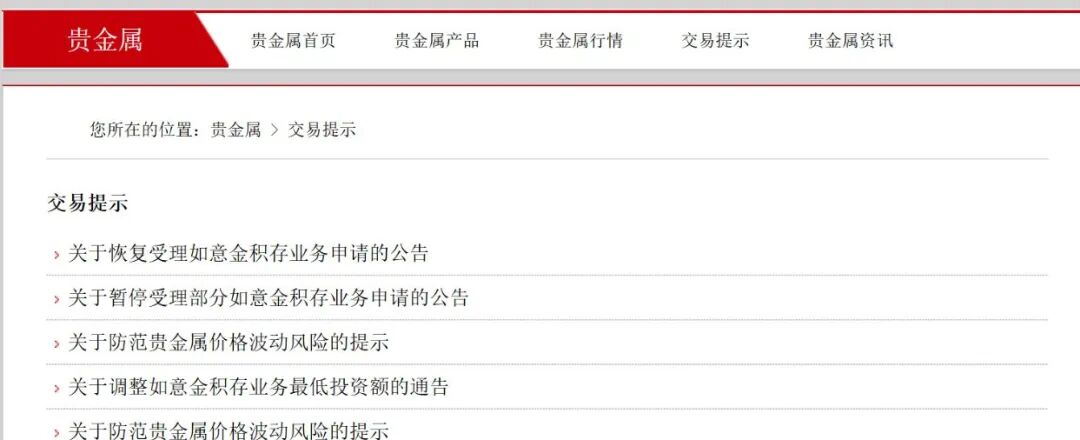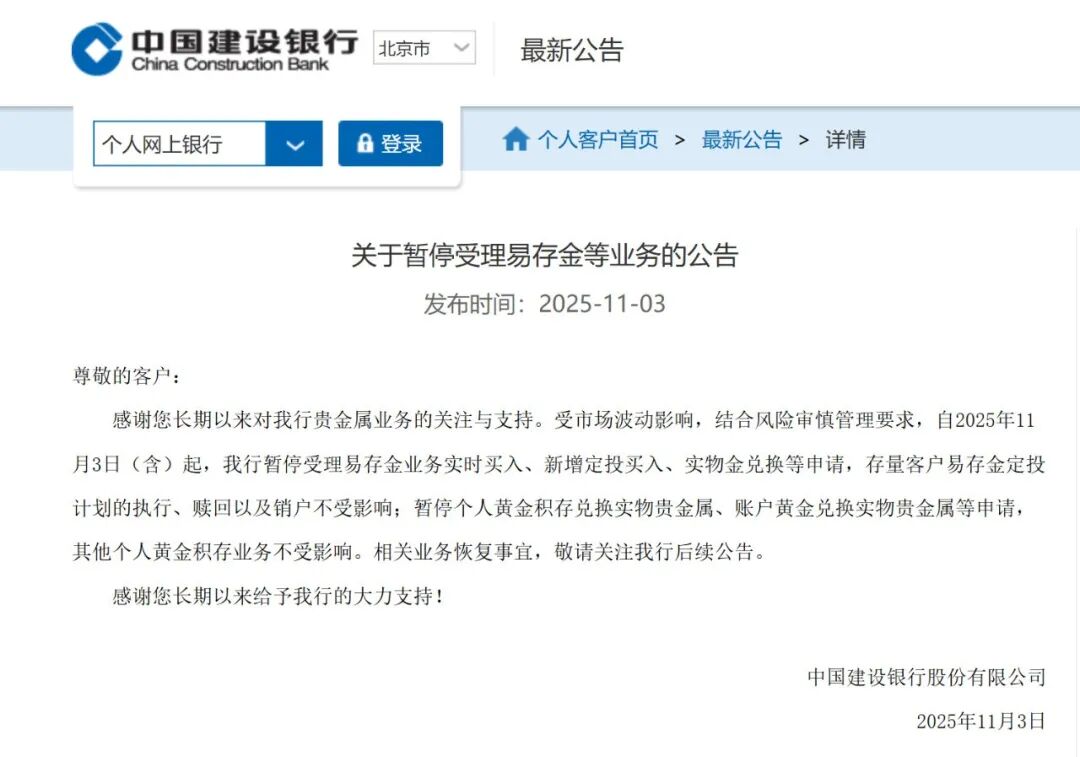 11月3日,工商银行发布《关于暂停受理部分如意金积存业务申请的公告》。同日,建设银行发布《关于暂停受理易存金等业务的公告》。