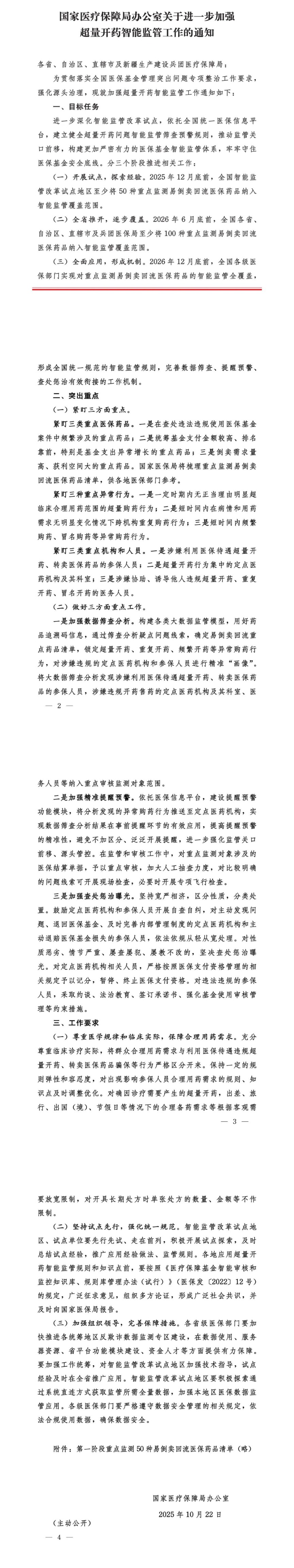国家医保局日前发布通知,进一步加强超量开药智能监管工作。通知提出,2025年12月底前,全国智能监管改革试点地区至少将50种重点监测易倒卖回流医保药品纳入智能监管覆盖范围。2026年6月底前,全国各省、自治区、直辖市及兵团医保局至少将100种重点监测易倒卖回流医保药品纳入智能监管覆盖范围。2026年12月底前,全国各级医保部门实现对重点监测易倒卖回流医保药品的智能监管全覆盖,形成全国统一规范的智能监管规则,完善数据筛查、提醒预警、查处惩治有效衔接的工作机制。