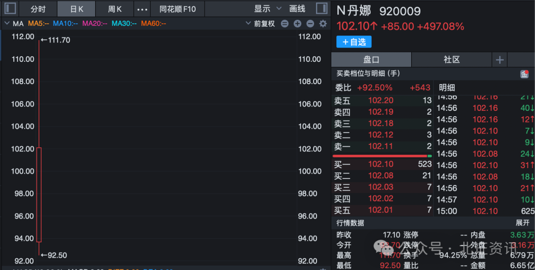 上市首日,丹娜生物表现强势,高开高走,每股股价一度攀升至111.70元,收盘暴涨497.08%至102.1元,为北交所再添一只百元股。
