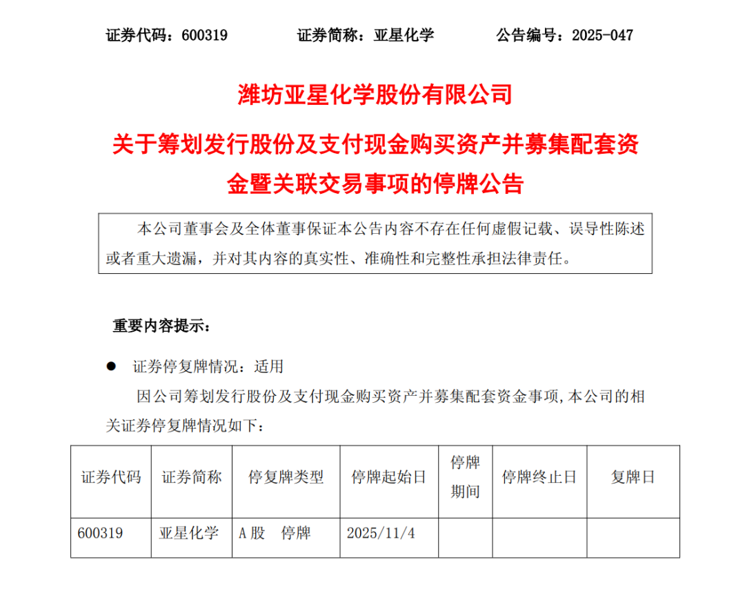 11月3日晚间,亚星化学(600319)发布公告称,公司正在筹划以发行股份及支付现金的方式购买天一化学控制权,或同步收购其他股东所持标的公司股份,同时公司拟发行股份募集配套资金。本次交易预计构成重大资产重组,构成关联交易。公司股票自11月4日开市起停牌,预计停牌时间不超过10个交易日。