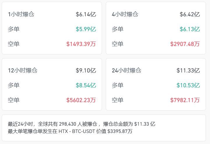 加密货币全线重挫,比特币跌超3%,最新报106159.9美元/枚。截至北京时间11月3日23:44,加密货币全市场近30万人被爆仓。