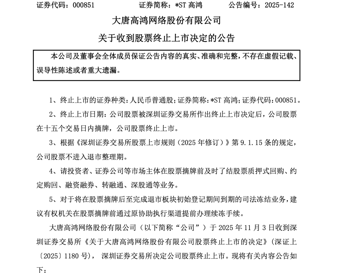 *ST高鸿(000851.SZ)11月3日夜间发布公告称,公司于当日收到深圳证券交易所《关于大唐高鸿网络股份有限公司股票终止上市的决定》,决定公司股票终止上市。公司股票在2025年9月1日至9月26日期间,连续二十个交易日的股票收盘价均低于1元,触及交易类强制退市情形。公司股票不进入退市整理期,将于被作出终止上市决定后十五个交易日内摘牌。公司已与太平洋证券签订《委托股票转让协议》,聘请其为代办机构。