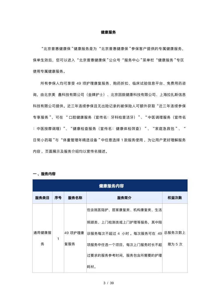 服务入口为北京普惠健康保公众号菜单栏中的“服务中心-健康服务-通用城市服务入口-49项护理康复服务”。服务仅限被保险人本人使用,总服务次数上限为5次。