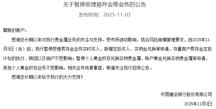 同日,建设银行也发布公告,自2025年11月3日(含)起,建行暂停受理易存金业务实时买入、新增定投买入、实物金兑换等申请,存量客户易存金定投计划的执行、赎回以及销户不受影响;暂停个人黄金积存兑换实物贵金属、账户黄金兑换实物贵金属等申请,其他个人黄金积存业务不受影响。