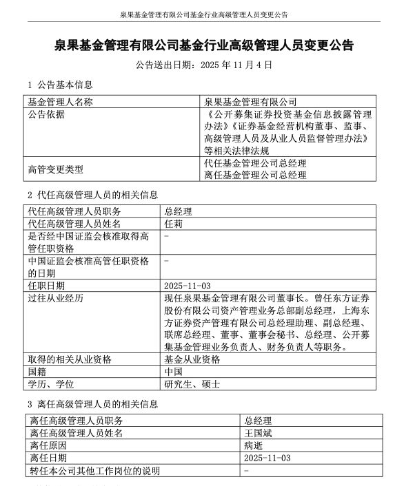 今天(11月3日),泉果基金发布公告称,总经理王国斌已于当日离任,离任原因为病逝。董事长任莉代任总经理。