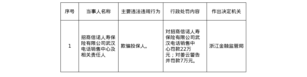 招商信诺人寿武汉电话销售中心被罚22万,责任人遭警告并罚款7万